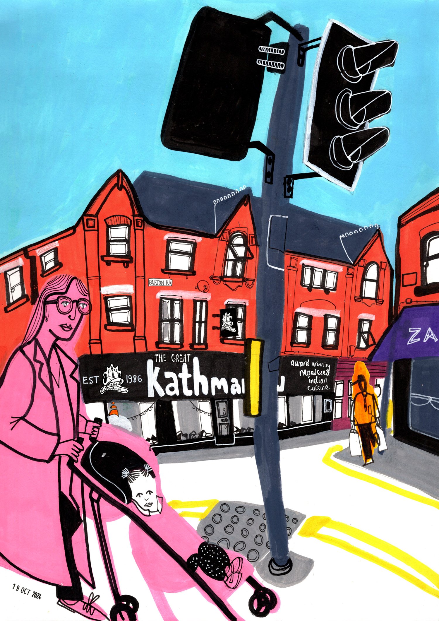 Three prints from sketches made of the junction of Lapwing Lane and Burton Road, featuring The Railway, The Metropolitan, The Great Kathmandu and GT Blagg.